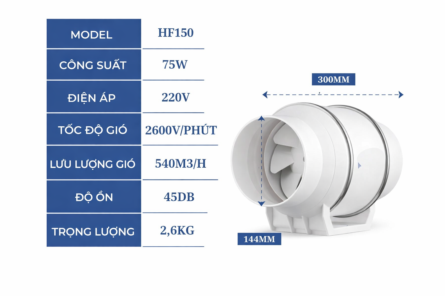 Quạt thông gió nối ống HF150 là thiết bị chuyên dùng để hút mùi, hút khói và đẩy không khí ô nhiễm ra ngoài thông qua hệ thống ống gió. Sản phẩm được thiết kế dạng ống tròn, lắp đặt linh hoạt âm trần hoặc trong trần kỹ thuật, phù hợp cho nhiều không gian khác nhau.